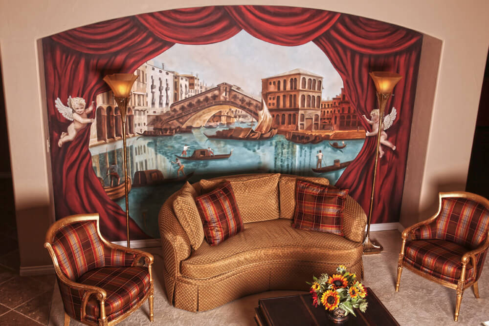 Cherub Mural – Highlands Ranch, CO, December 2010. This mural project began when the client reached out to us with an idea inspired by a mural they had seen in Las Vegas. After consulting with them, we created several renderings and narrowed it down to the one that best fit the space. We also offered the client the option to adhere canvas to the wall surface, allowing them to remove and take the mural with them if they ever decided to move. They were thrilled with this idea. With the formalities settled, our next challenge was to paste the canvas and paint the mural within a tight 5-day deadline, just in time for the client’s Christmas party. We not only met the deadline but were also honored to attend the party and celebrate with their wonderful friends and family. Thanks, guys!