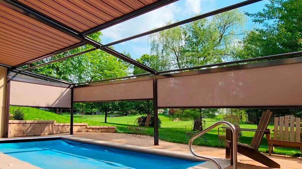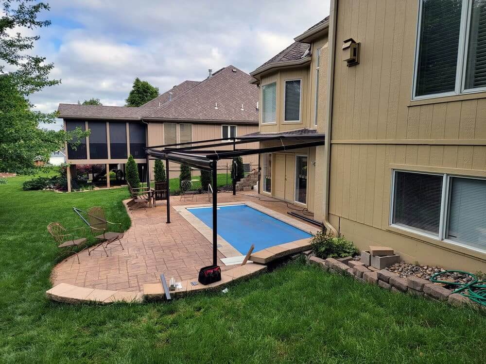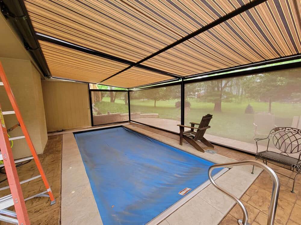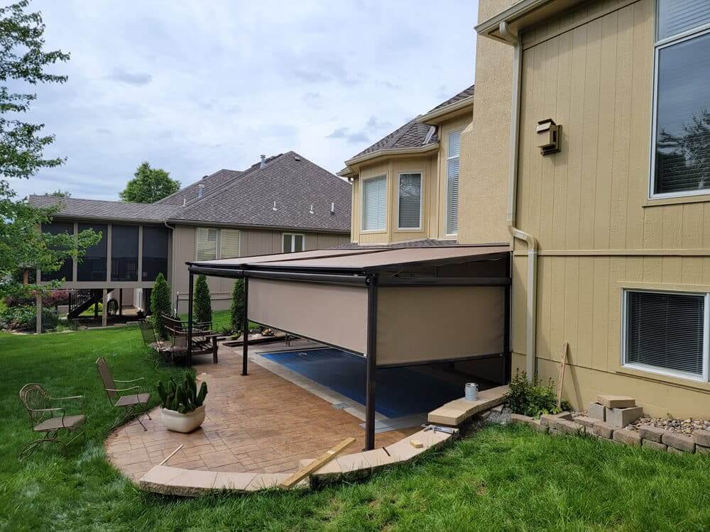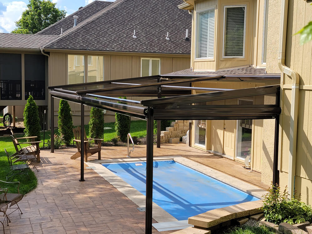 Pool Enclosure 2022, Kansas City, MO. This home, residing in a community that shares open spaces with countless other residences and restricts the use of privacy fences, posed a unique challenge. Our solution combined innovative motorized retractable screens and Sunplus shelter coverings equipped with integrated rain gutters, smart control wireless remotes, and automatic sun & rain sensors. This dynamic setup not only provided the homeowners with the much-needed privacy to enjoy their pool and patio area but also offered the flexibility to customize their space. They can now choose precisely which panels to open or close and to what extent, ensuring an adaptable and comfortable outdoor experience tailored to their needs.