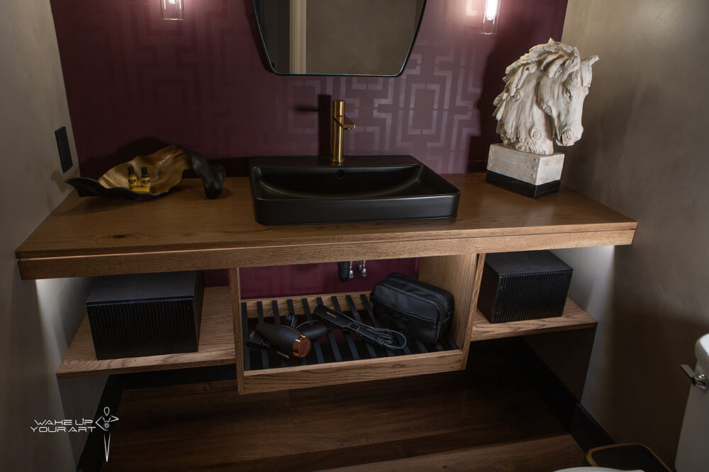 The vanity was carefully designed and built from white oak, then distressed to give it the appearance of reclaimed or repurposed wood. To support the weight of the ceramic vessel sink and prevent long-term movement, we reinforced the front of the vanity with a concealed steel tube spanning from side to side. Creating the LED lighting was especially challenging, as it required a continuous, uninterrupted light line along the top edge while working around the hidden steel reinforcement.