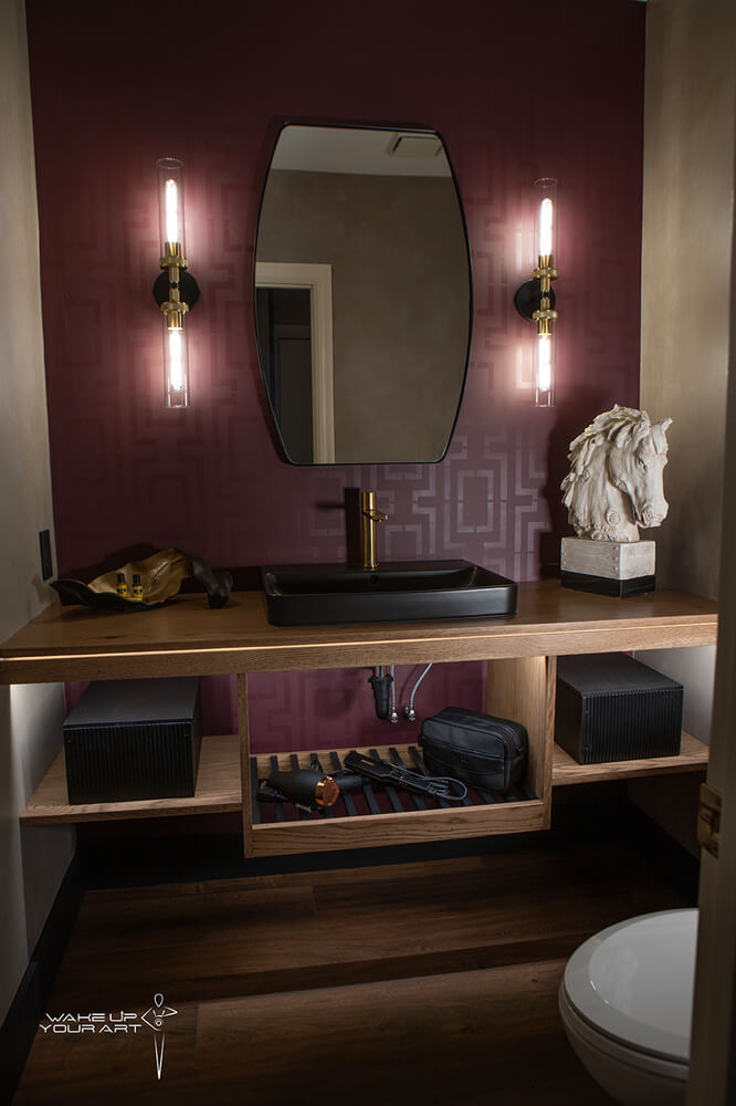 From hand-painted stencil walls to a custom-designed floating oak vanity equipped with programmable LED lighting and a semi-recessed vessel sink, this powder room now carries a modern, elegant vibe.