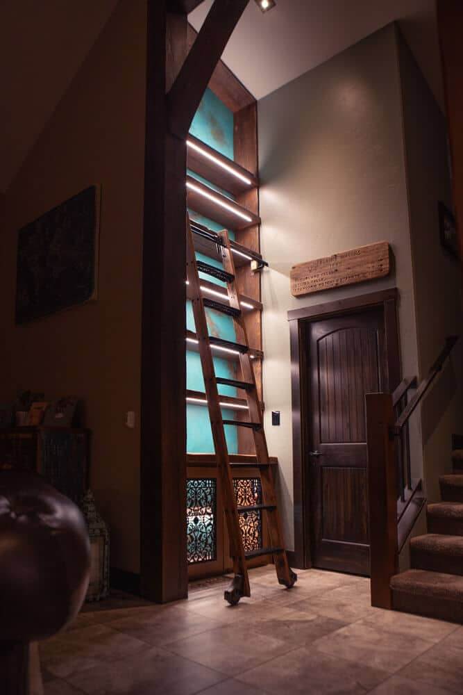 The final result was stunning. The 15-foot tall structure seamlessly blended with the existing décor while standing out as a unique feature. The combination of reclaimed wood, dimmable LED lighting, and a retractable rolling library ladder not only met the clients’ needs but also exceeded their expectations.