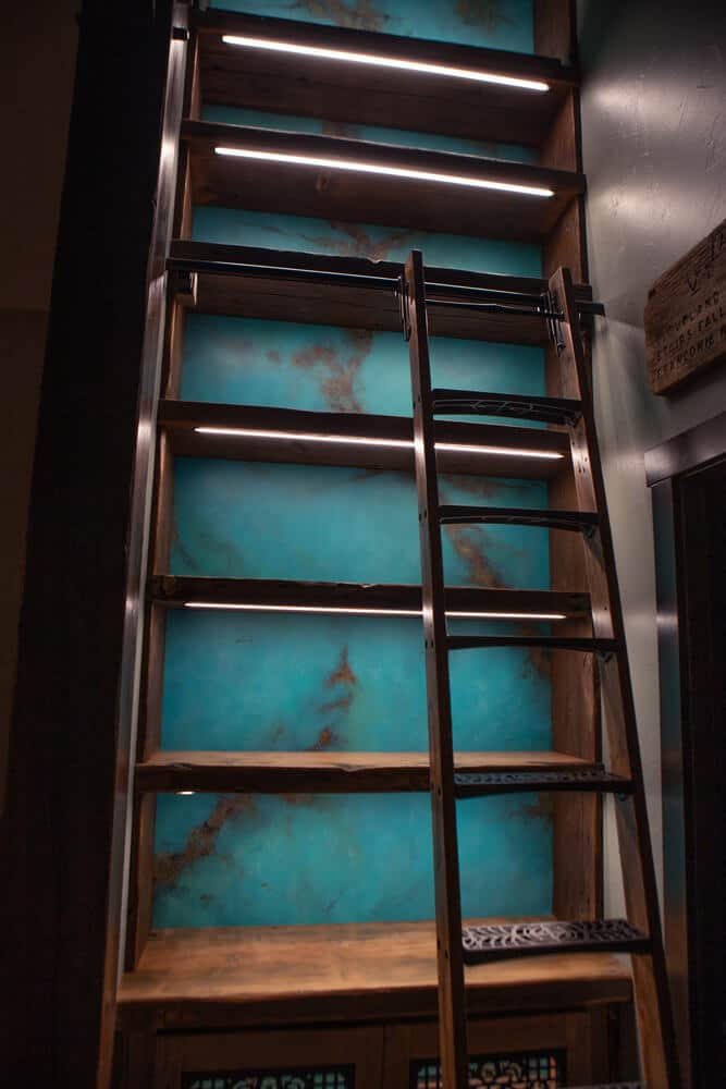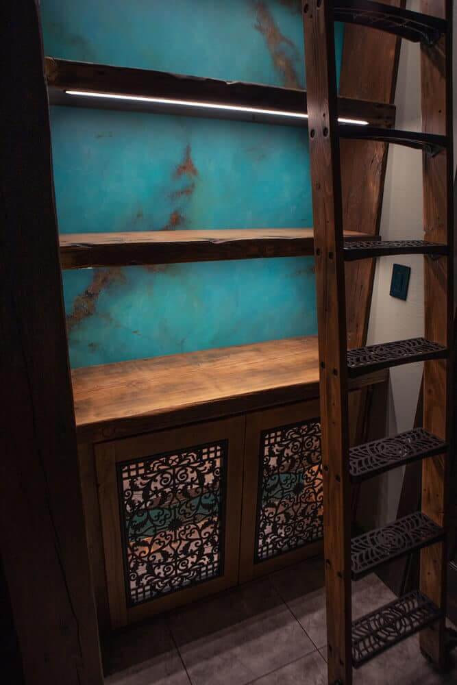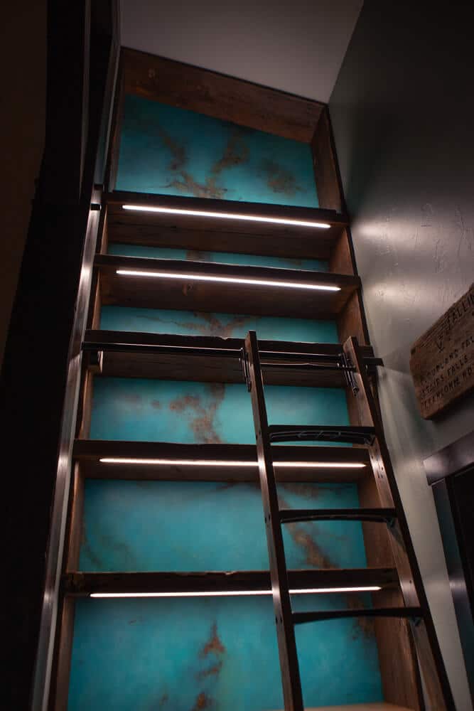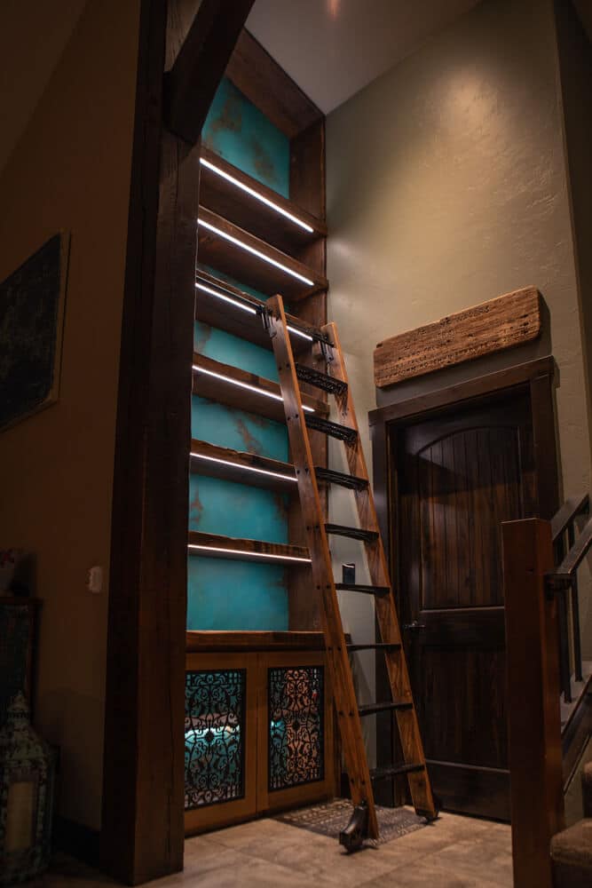Recessed mounted COB dimmable LED lighting was integrated into the shelves to add a modern touch and highlight the rustic wood. For the liquor cabinet, we included two metal grated cabinet doors with interior LED lighting that creates a beautiful ambiance with the glass bottles and stemware, adding to the rustic charm while providing functionality. The 9-foot retractable rolling library ladder, made from the same reclaimed wood as the bookshelf, ensured easy access to all shelves while maintaining a cohesive look.